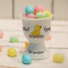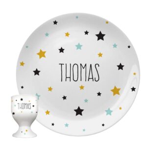 Personalise our star themed breakfast set with a name using up to 15 characters. Your chosen name will feature on both the 8%u201D bone china coupe plate and the bone china egg cup. It would make a fabulous gift for a little one at Easter. Kiln fired, this bespoke set is dishwasher and microwave safe. Dimensions: Plate – 20 x 20cm. Egg Cup %u2013 7 x 4 x 4cm