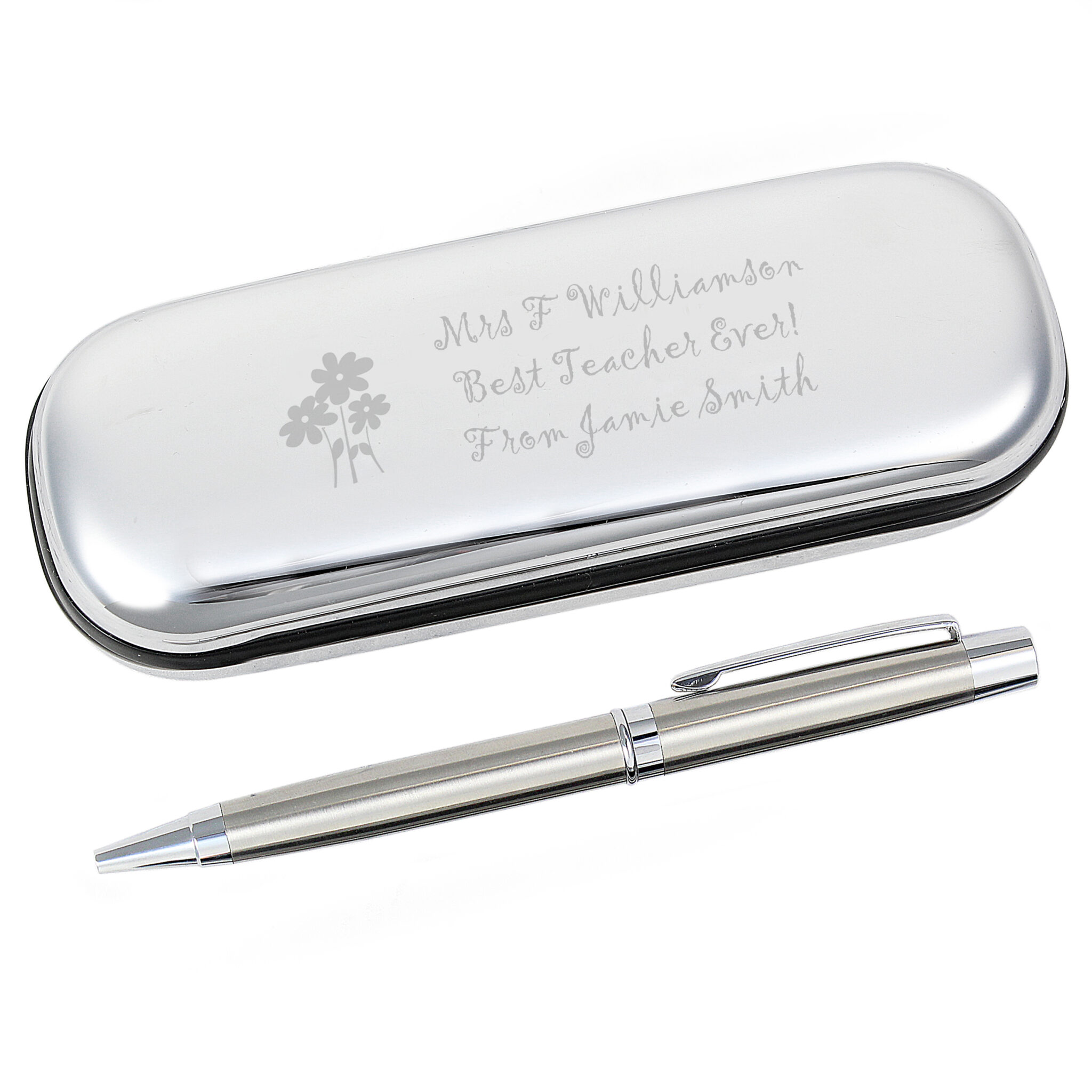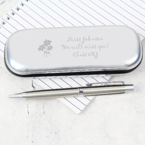 This chrome plated pen and box set includes a ball point pen, the box features a flower motif and can be engraved with any message to your teacher across 3 lines up to 20 characters per line.
