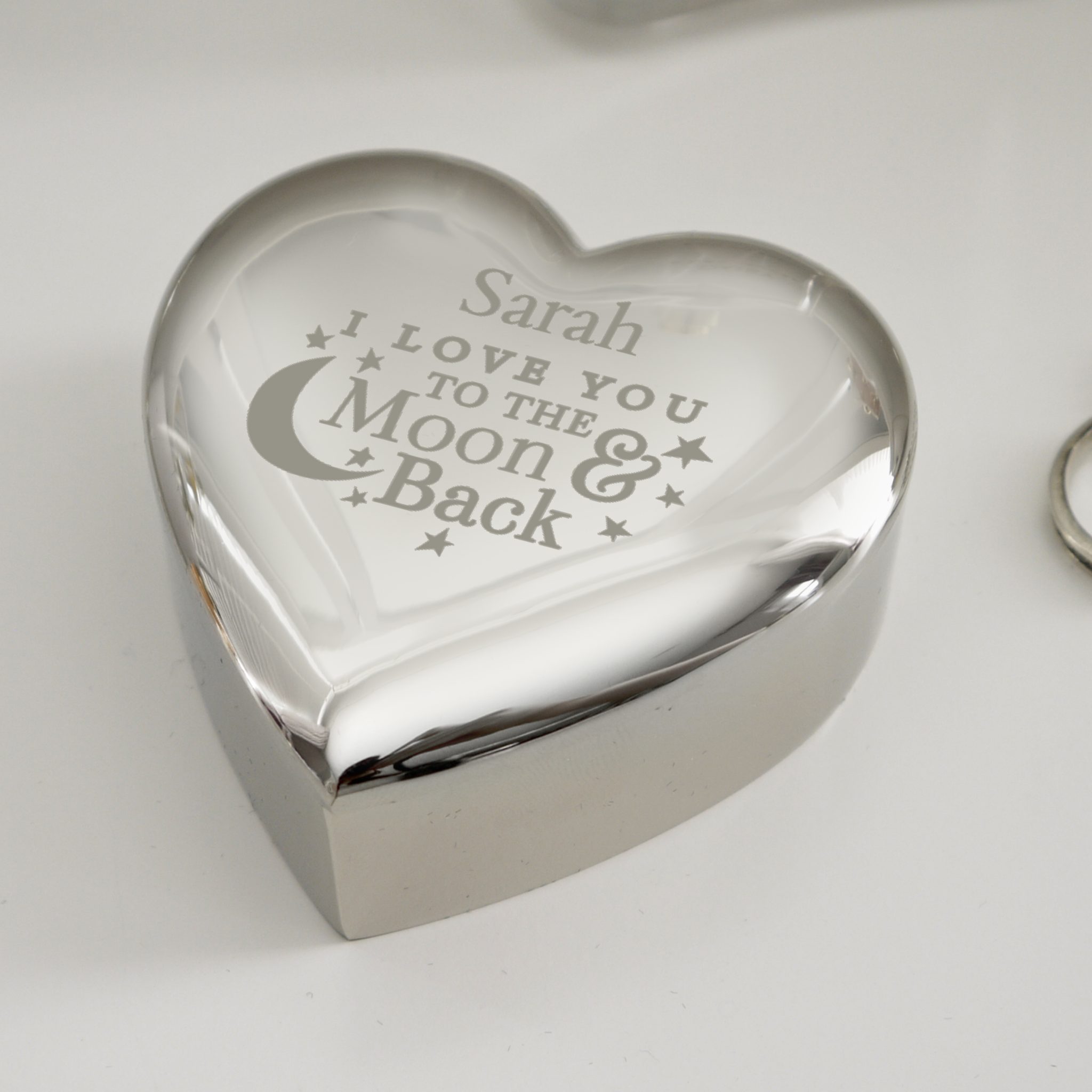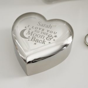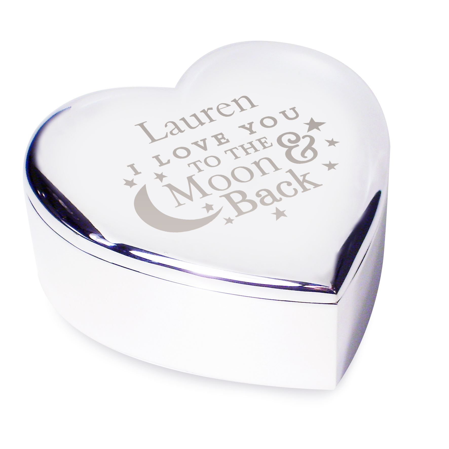 Personalise this charming Heart Trinket box with a Name up to 12 characters The text ‘I Love You TO THE Moon & Back’ is fixed Fabric Lined Trinket is Nickel plated.
