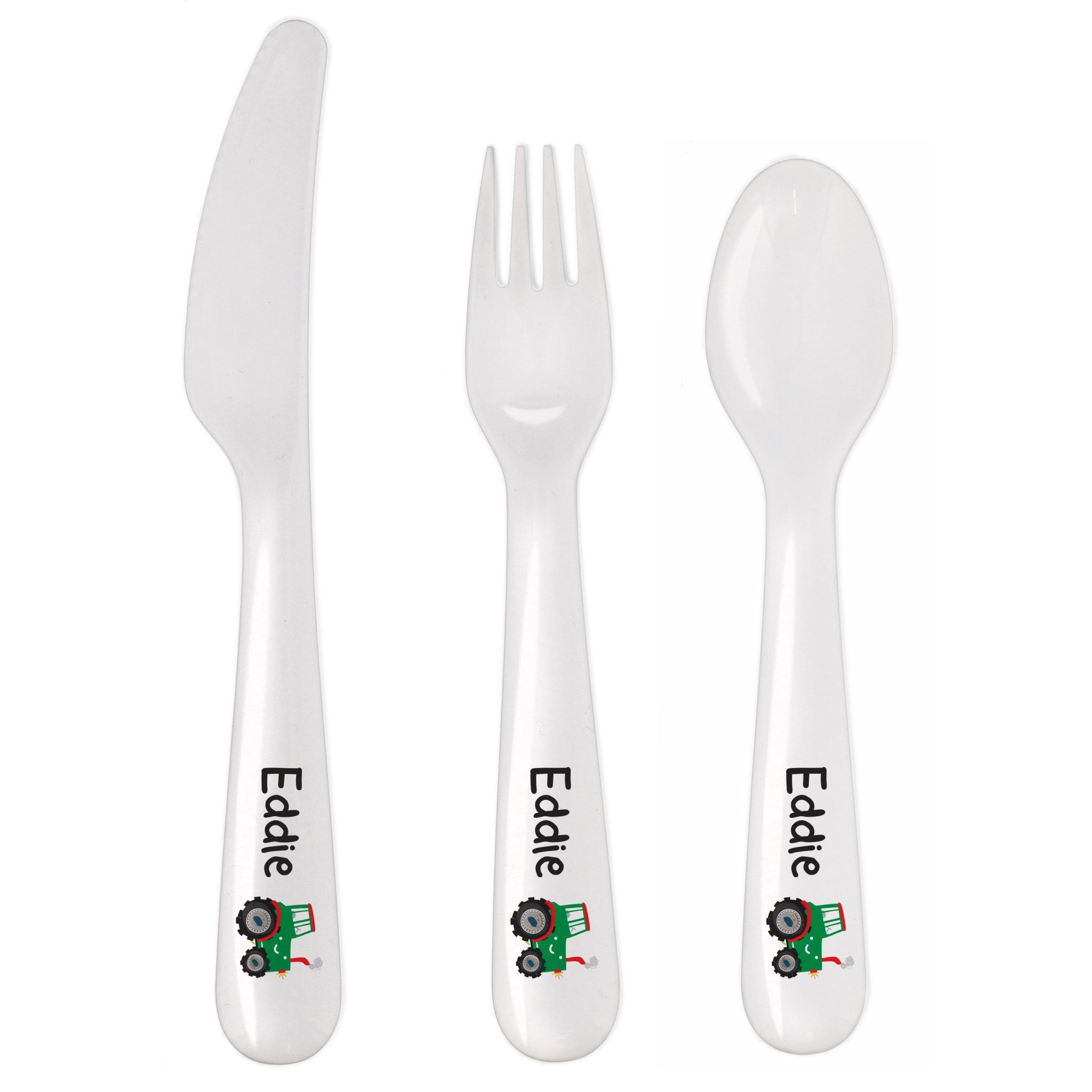 - This practical 3 piece set of plastic cutlery featuring a tractor design can be personalised with any name up to 12 characters in length.