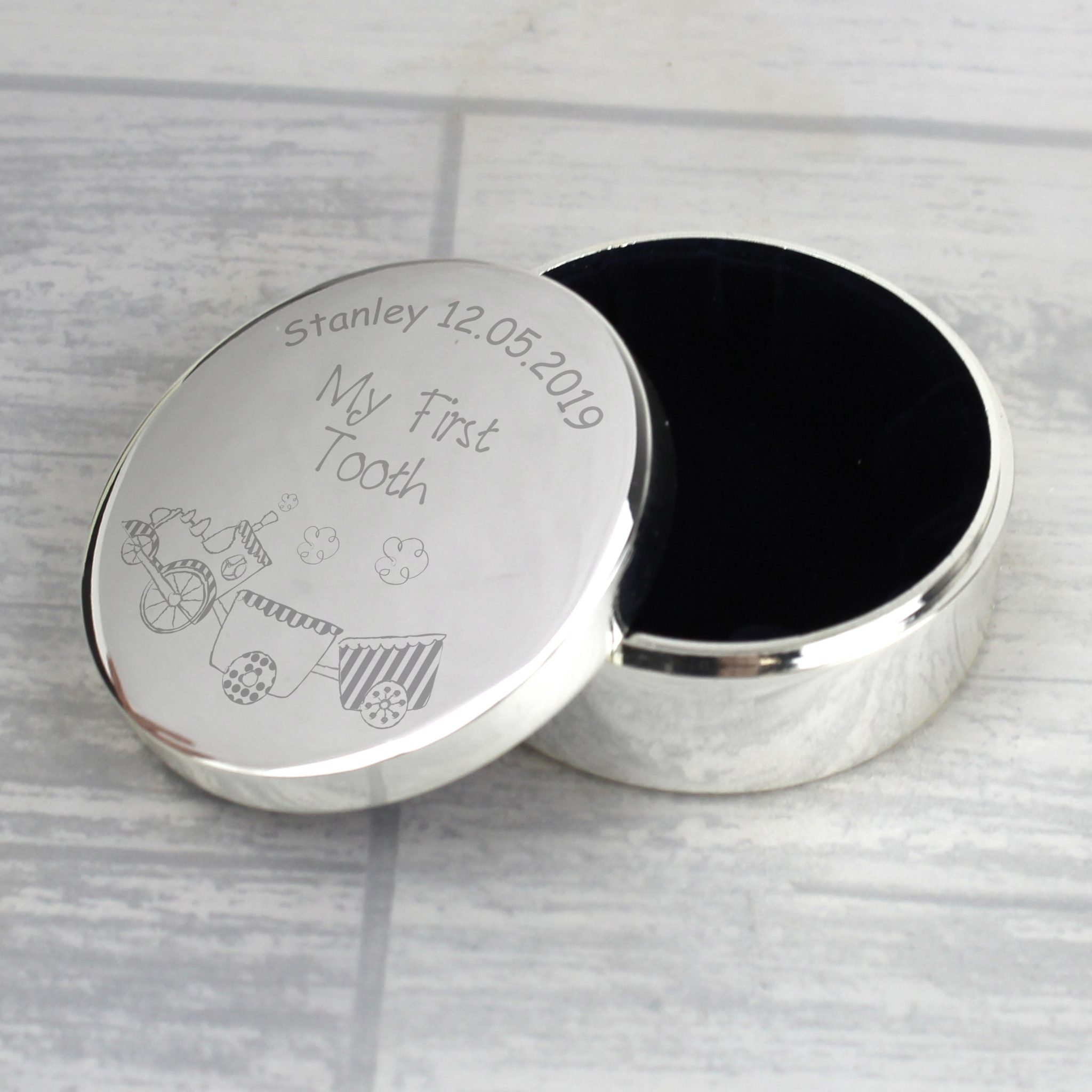 Train first tooth trinket box You can personalise the lid of this silver plated trinket with any message of your choice up to 20 characters, but a first name and date would suit this product the best.
