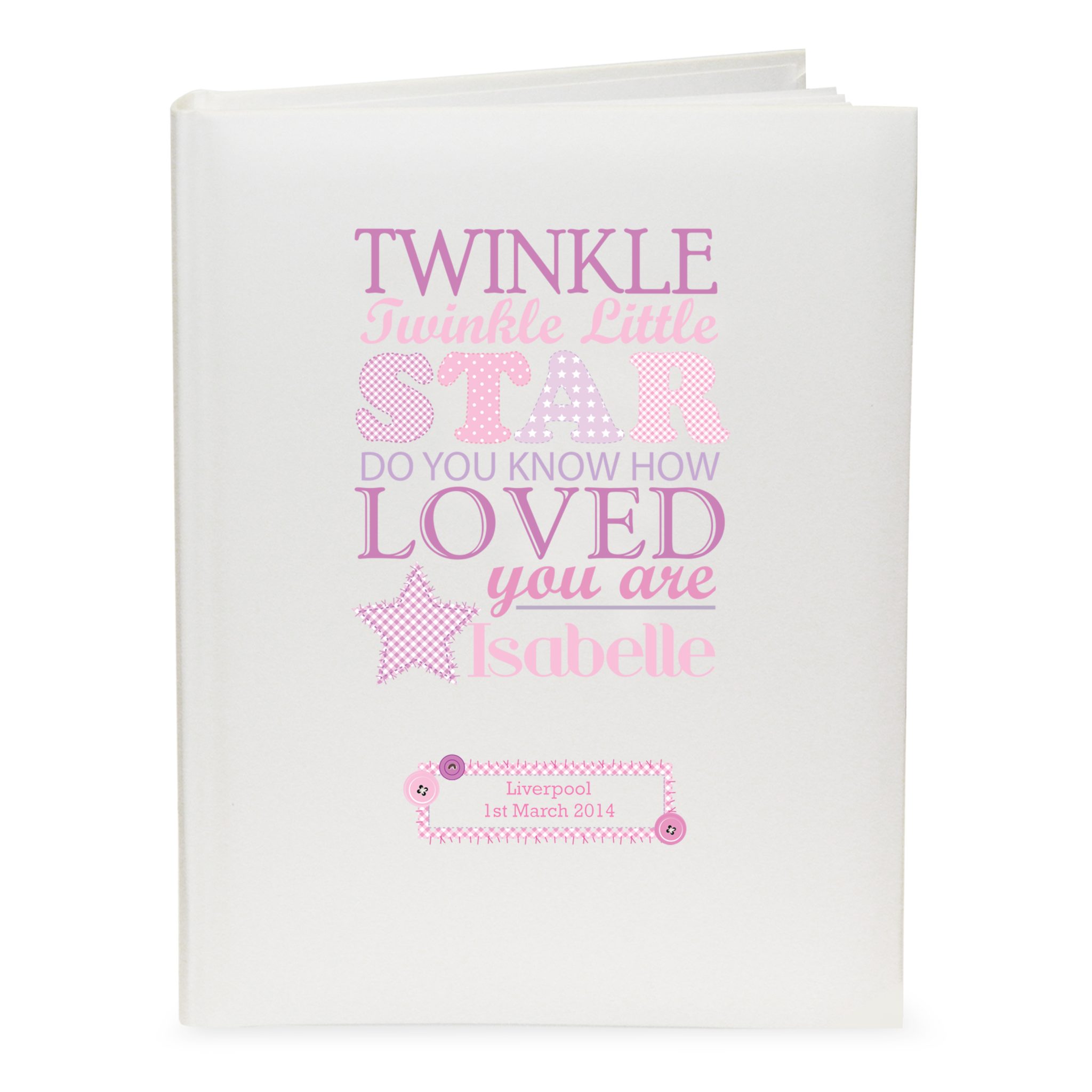 Personalise this Twinkle Girls Album with a name up to 12 characters and a message spread over 2 lines up to 20 characters per line. ‘Twinkle twinkle little star do you know how loved you are’ is fixed text.