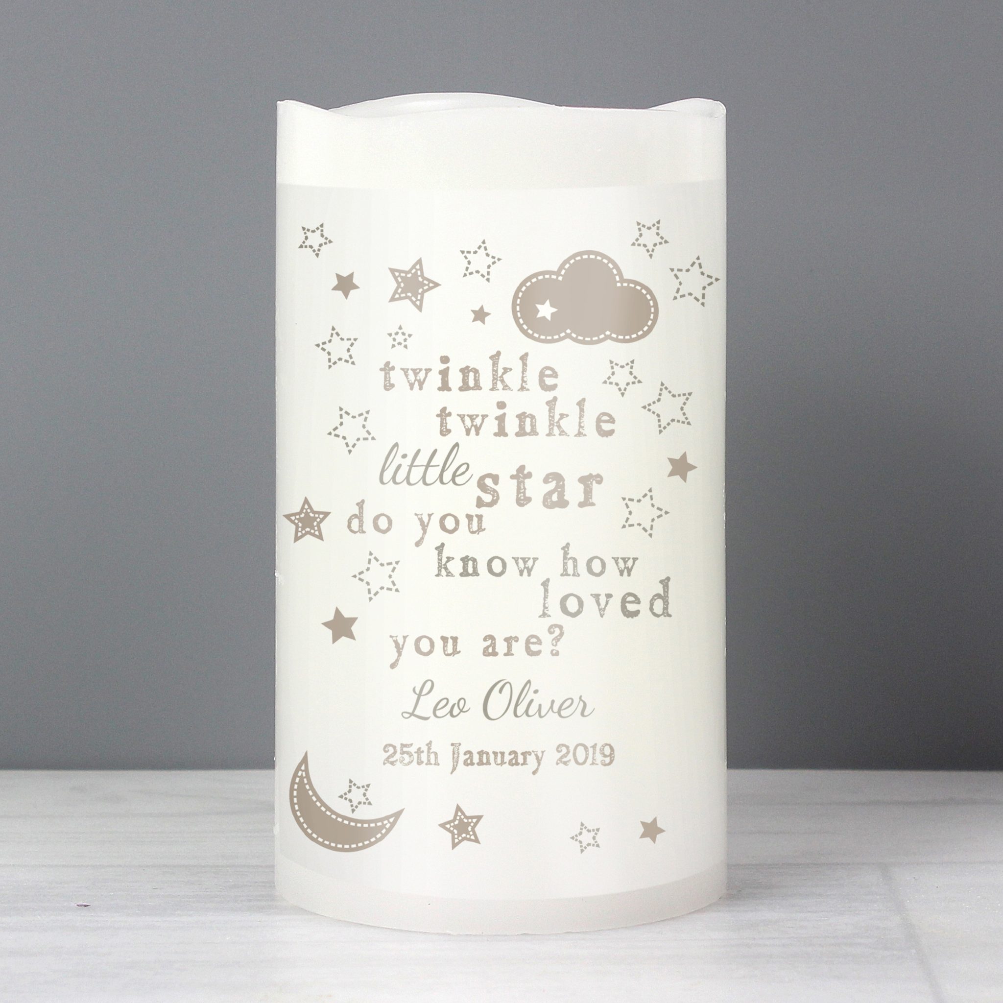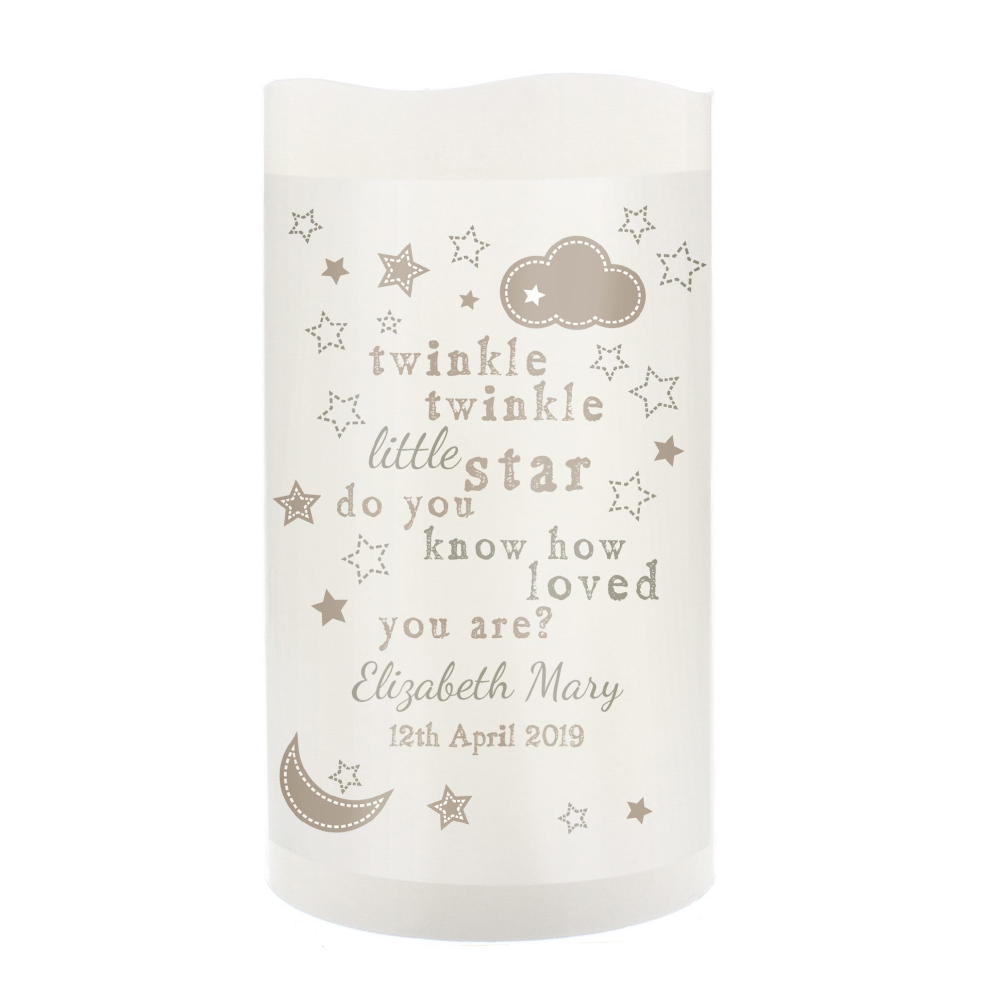- The personalisation will appear as entered. ‘twinkle twinkle little star, do you know how loved you are?’ is a fixed part of the design The LED candle has a flame effect and is coated in real wax.