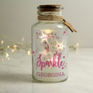 This beautiful Personalised Unicorn LED Glass Jar is a perfect addition to your child’s bedroom Personalise this LED Glass Jar with a single line of personalisation Line 1 – 12 characters ‘Find a reason to sparkle’ is fixed text and cannot be changed.