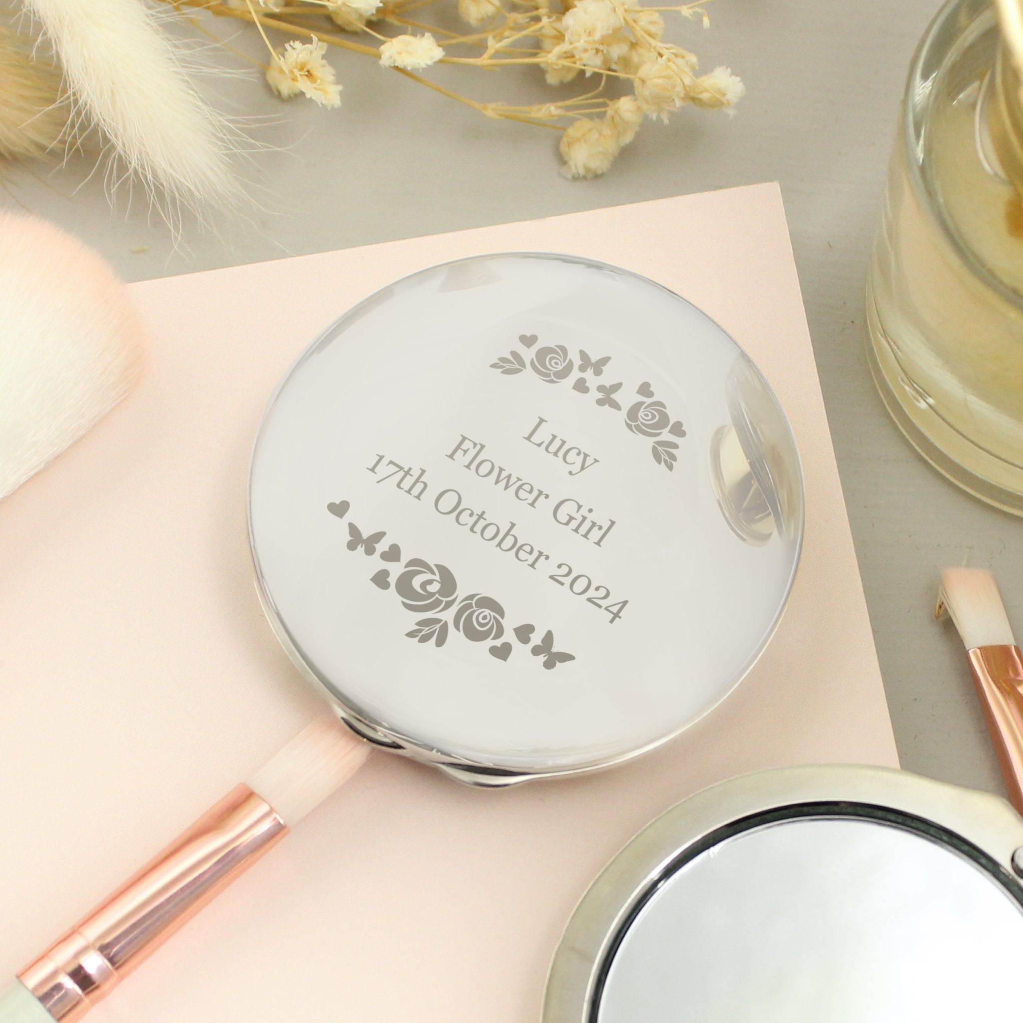 - Personalise this compact mirror with a message over 3 lines of 20 characters per line.