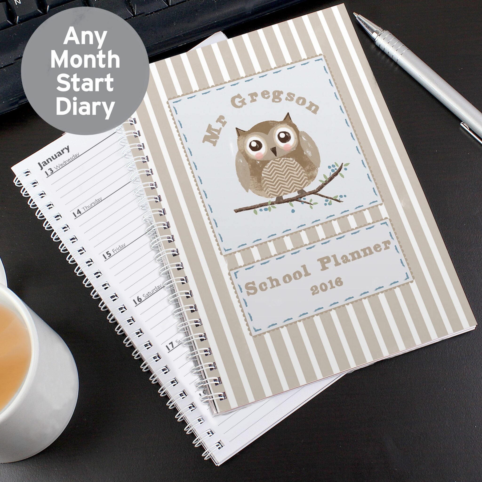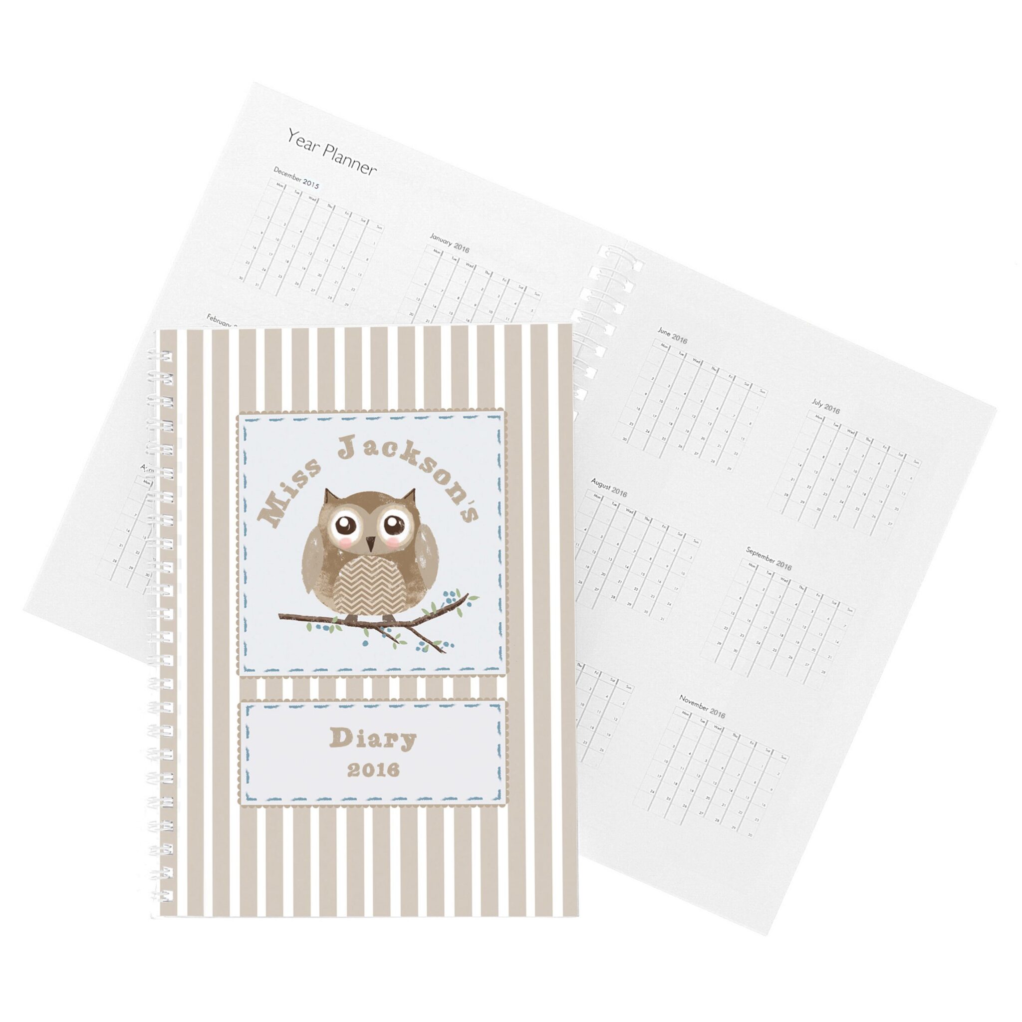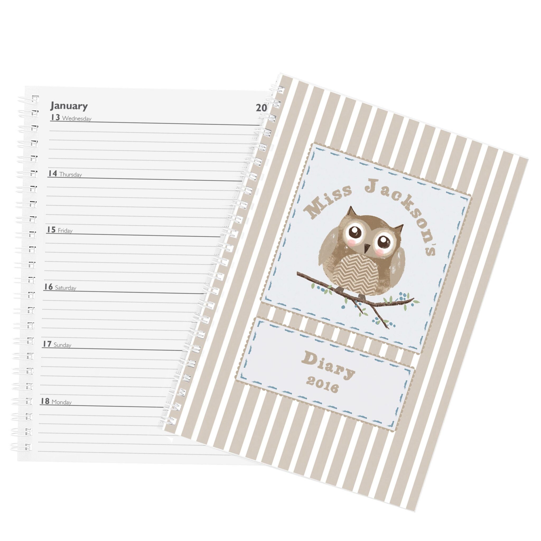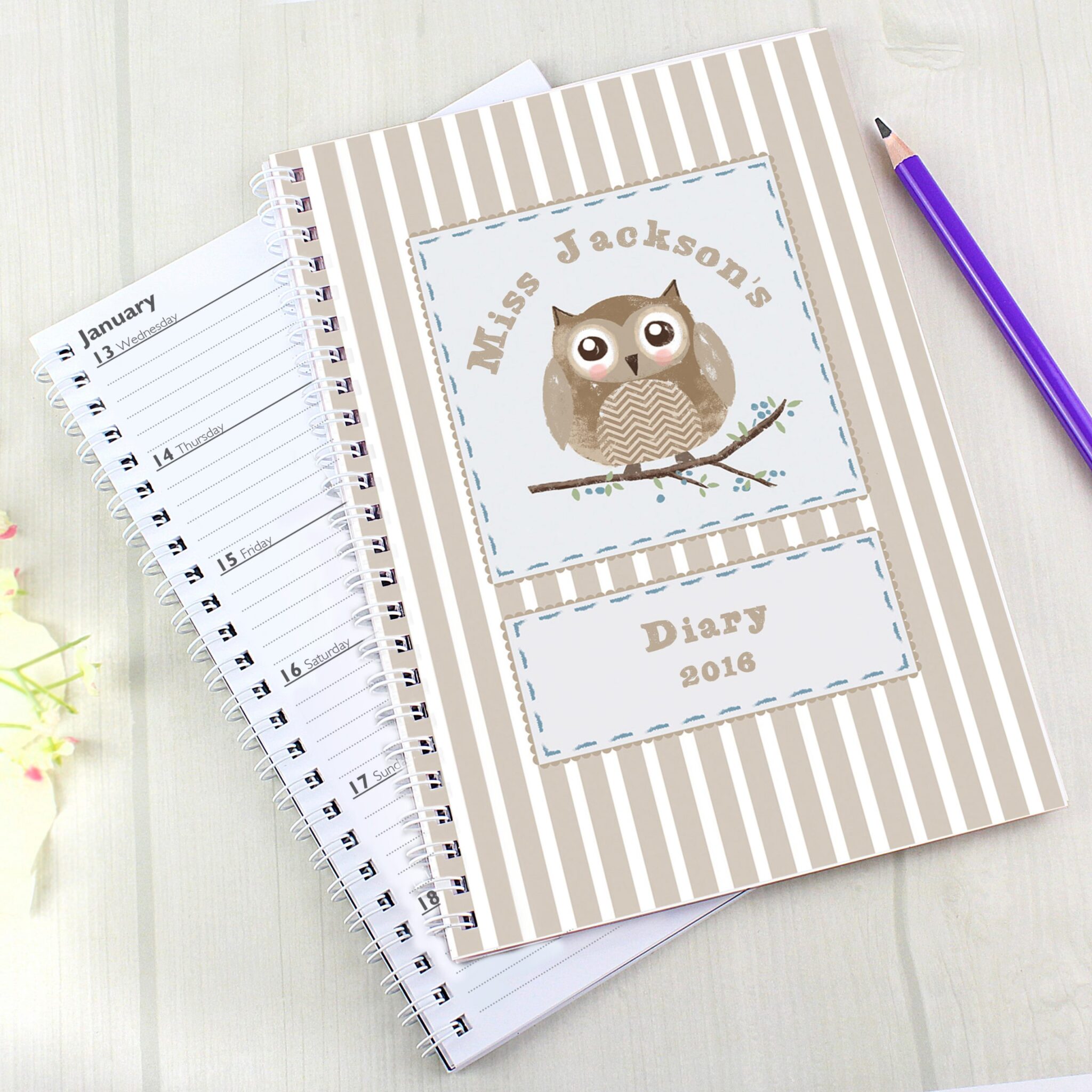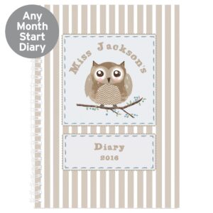 This Owl themed diary can be personalised with 3 lines of text up to 15 characters per line.