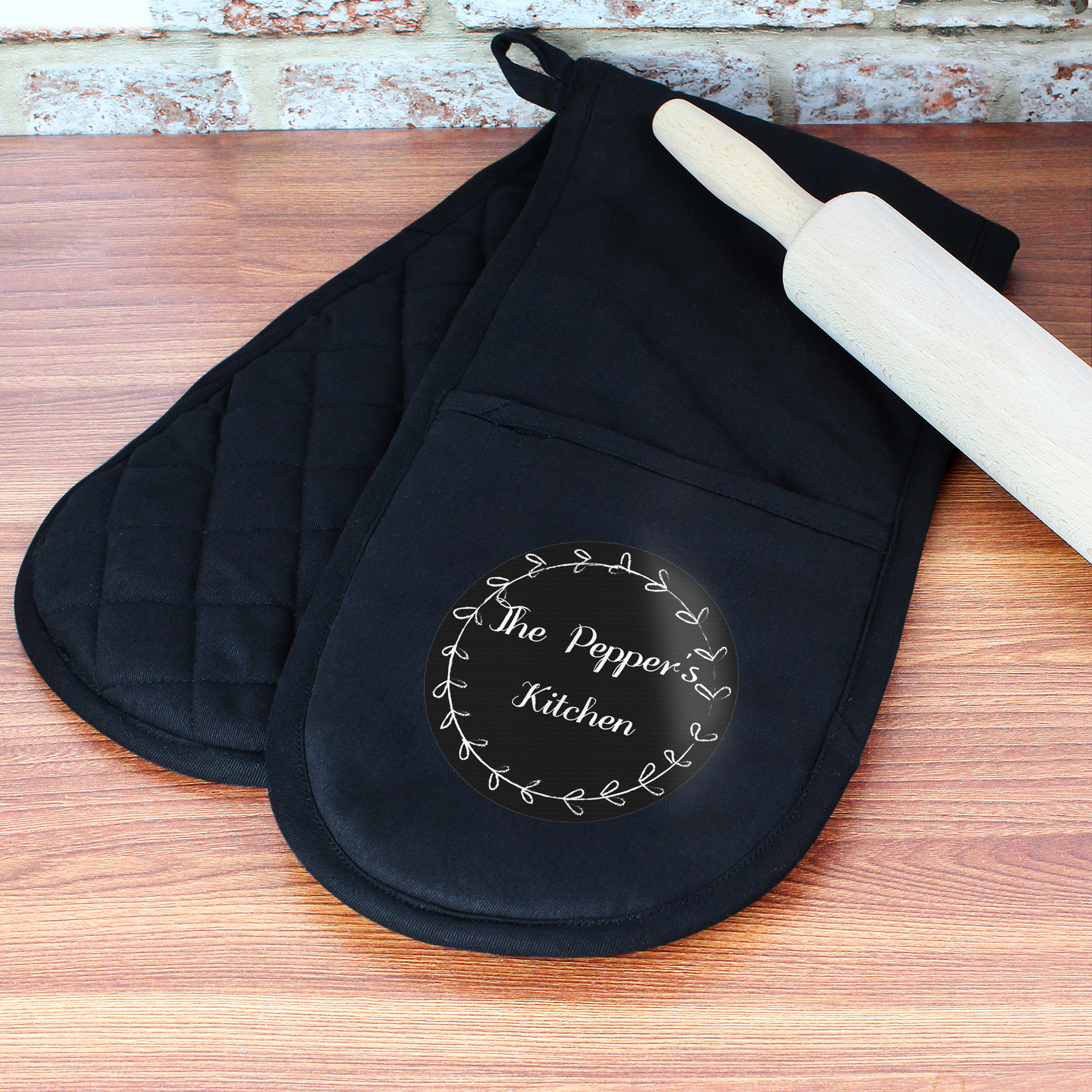 - You can personalise this Wreath Oven Glove with 2 lines of text up to 15 characters per line.