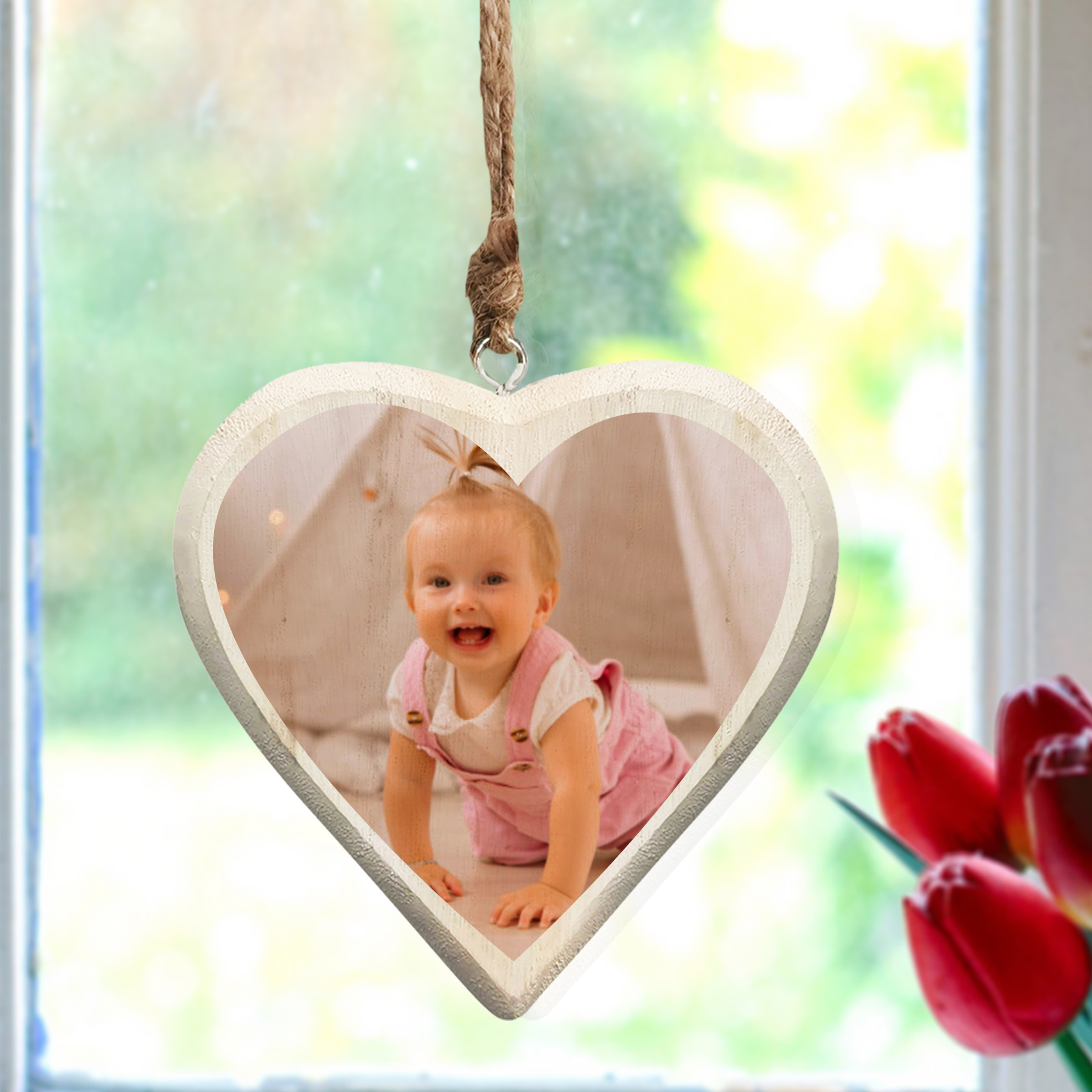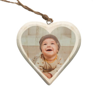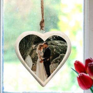 Personalise this lovely wooden hanging heart with a special photo. We will crop your image into a heart and print onto the wood. This painted white heart is complete with rope ready to hang and measures 15cm height (excluding rope) x 14cm width x 3cm depth.