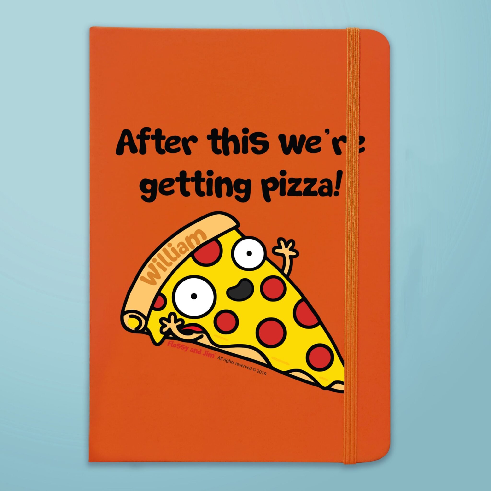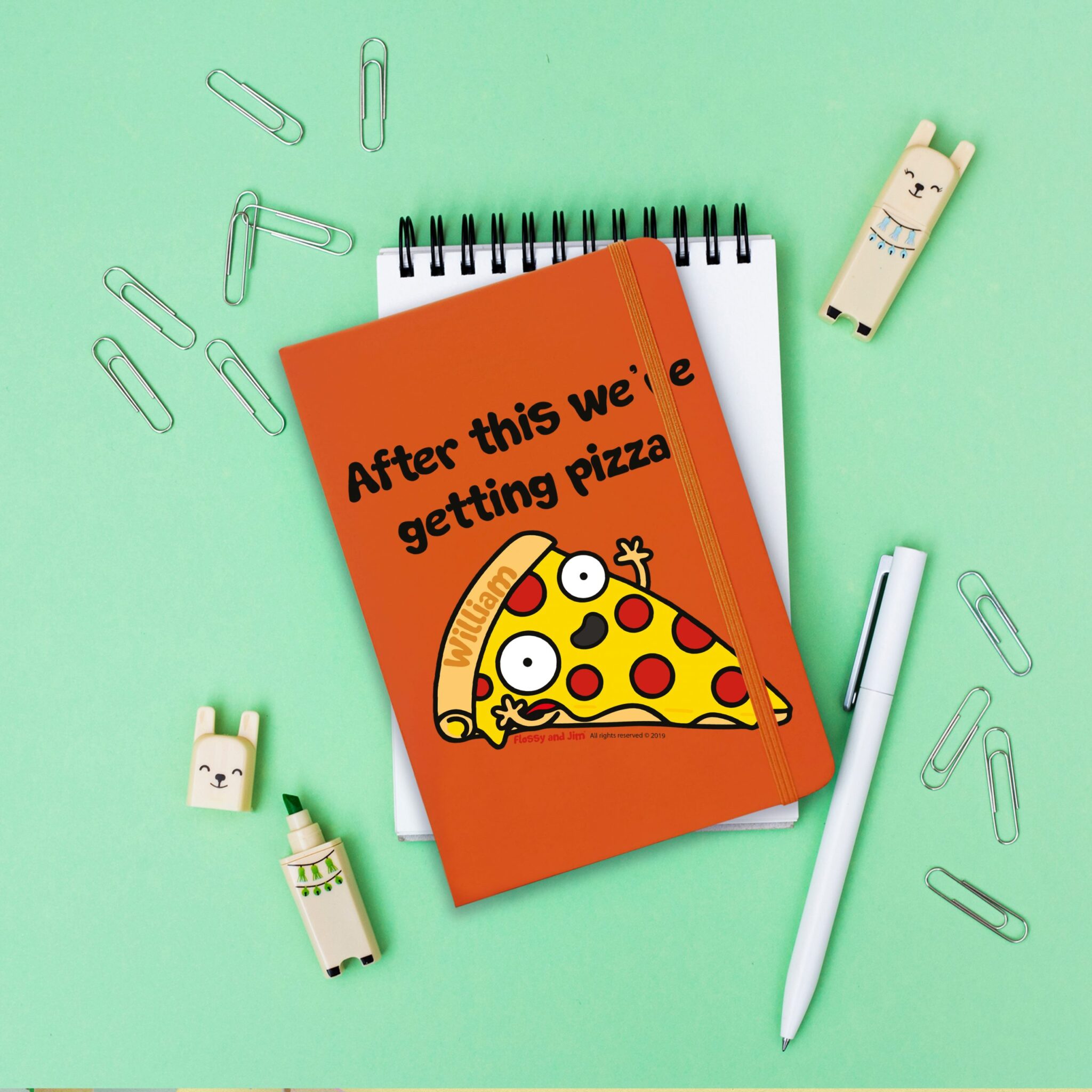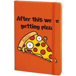 Add a name of up to 15 characters to this pun-tastic notebook! Your chosen name will feature in the crust of the pizza below the fixed text ‘After this we’re getting pizza.’ The orange soft feel A5 Notebook with matching elastic closure band and internal bookmark ribbon, contains approximately 80 lined pages.