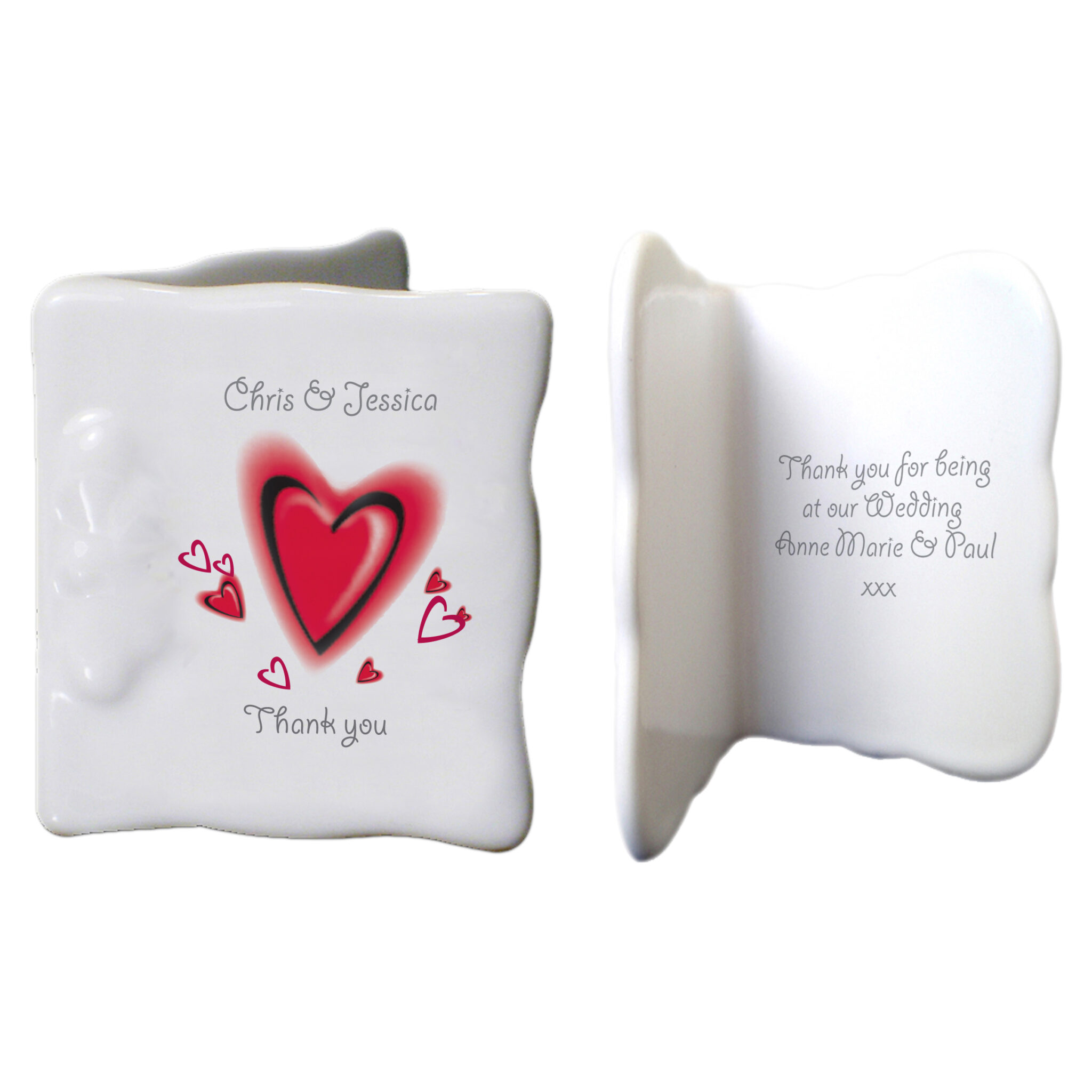 For your heartfelt message to last much longer, give them a card made of fine bone china. Unlike cardboard, this card will not blow off the mantelpiece, or need to be recycled. Your card will stand the test of time and be cherished long after the event is over. With a unique red hearts design and the recipient’s name on the front, your message is expertly printed directly onto the bone china inside this unique card. Perfect for Valentines, anniversaries or any loving occasion