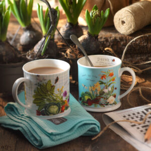 Gardeners need watering too! These two attractive RHS mugs will make quite an impact in any greenhouse, shed or kitchen. Personalise with any name/s of up to 25 characters. Name 1 will be fired on to the white mug and Name 2 on the blue. Each mug is 8.5cm tall and 8.5 cm diameter and the set is finished in a branded gift box with an acetate lid making this a lovely gift.