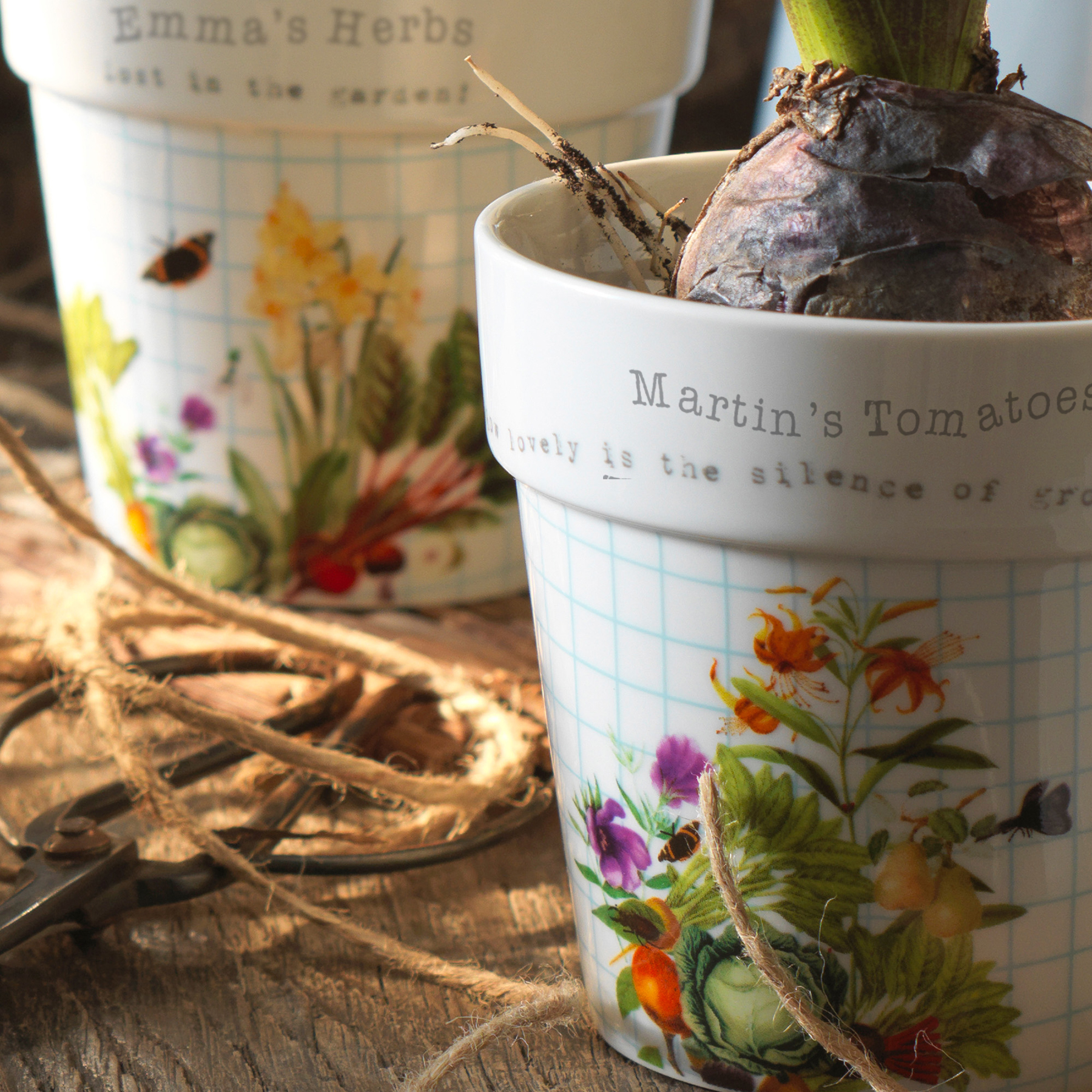 Brighten up your windowsill with this charming pair of porcelain RHS planters. Personalise each pot with a message of 20 characters including spaces. Message Line 1 will appear above fixed text ‘Lost in the garden’ and Message Line Two will appear above fixed text ‘How lovely is the silence of growing things’. Each measures 100 x 68 x 95cm. The attractive branded box packaging makes them a great gift.