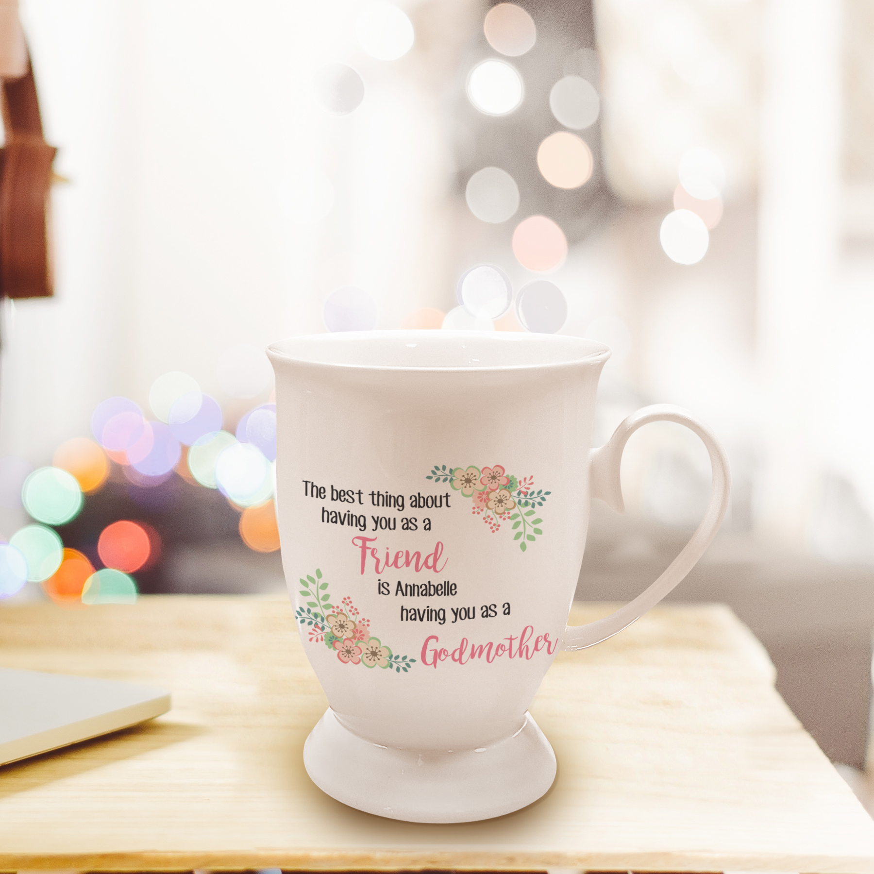 Personalise this beautiful shaped bone chine mug by adding the recipient’s role to you, your child or children’s name/s and the recipient’s role to them. The message will read The best thing about having you as a [Message line 1] {eg. Mother} is [Message line 2] {eg. Connor & George} having you as a [Message line 3] {eg. Grandma}. ?