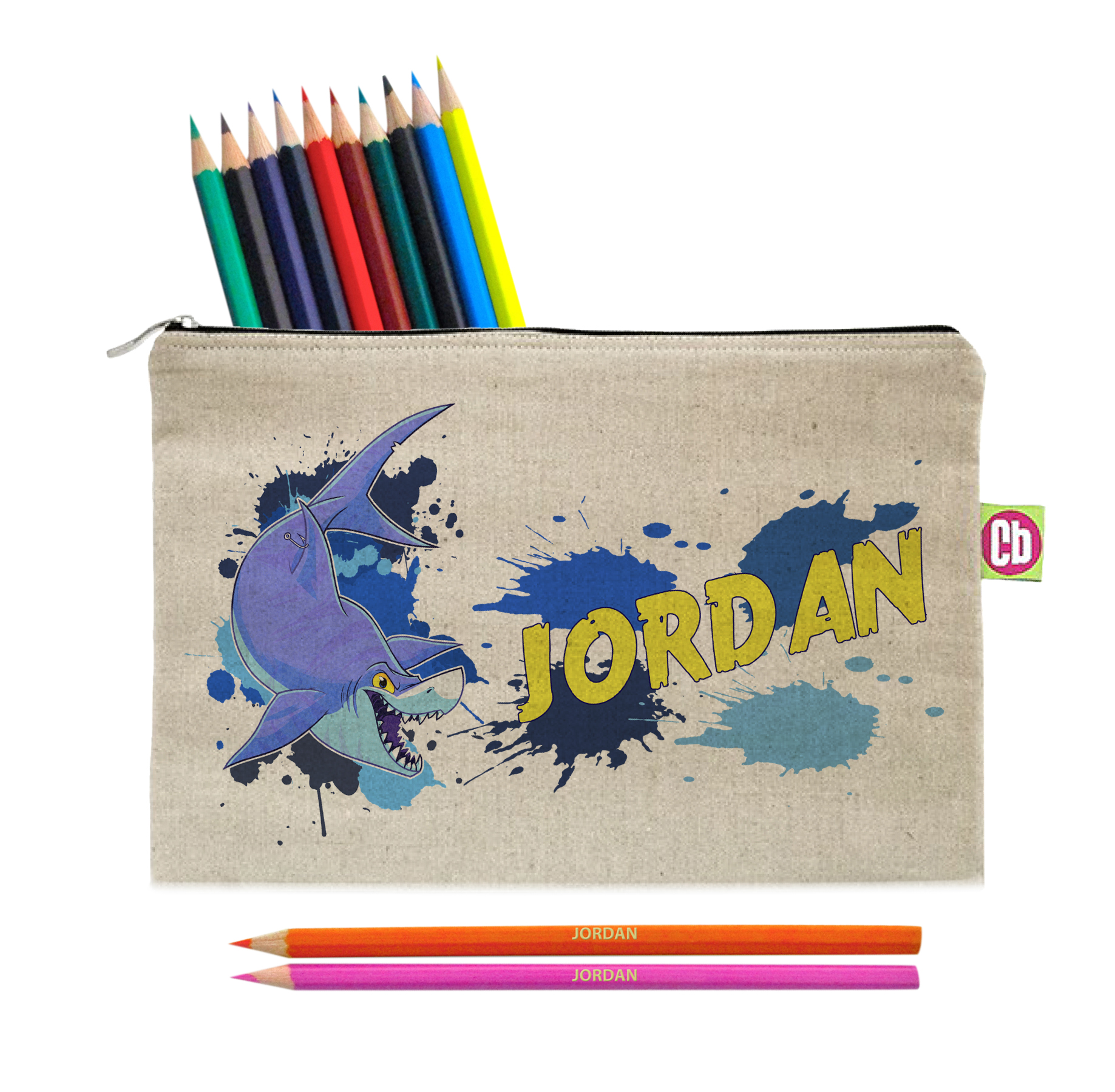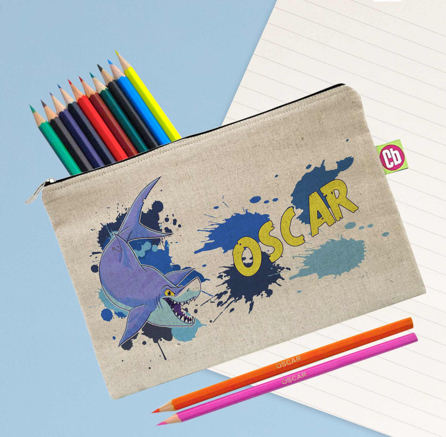 This colourful shark pencil case is a natural light oatmeal colour with a padded inside. Simply personalise both the pencil case & 22 coloured pencils with any name of up to 15 characters. The pencil case measures 25cm wide by 16cm high.