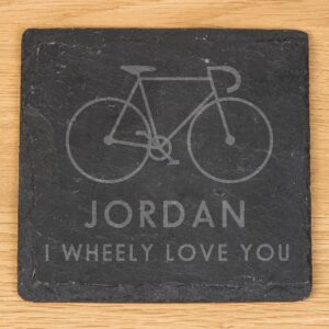 This square slate coaster makes an ideal addition to any coffee table. Not only will this coaster protect their table from scorch marks and spills, but it can be a lasting reminder of how much you love them. Personalise it with their name using up to 15 characters above the fixed text ‘I wheely love you’. Dimensions 10 x 10 x 0.5cm.