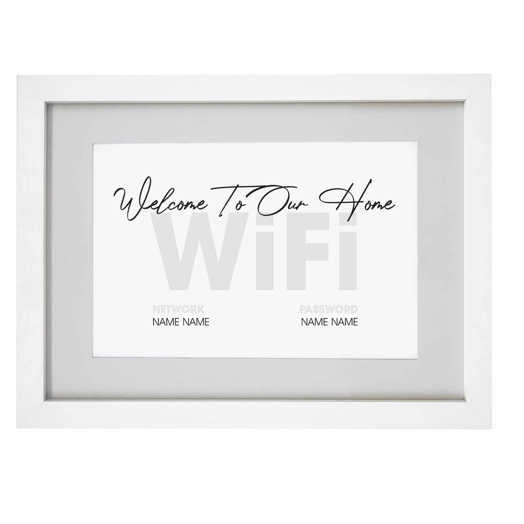 Never go routing for your WIFI password again with this handy framed print. Personalise with your network name and password. Your chosen personalisation will appear below fixed text ‘Welcome To Our Home’, ‘Wifi’ and ‘Network/Password’. The frame is 34.5cm tall, 25.5cm wide and 1.5cm thick with an easel back. The print inside is 9″ x 6″.